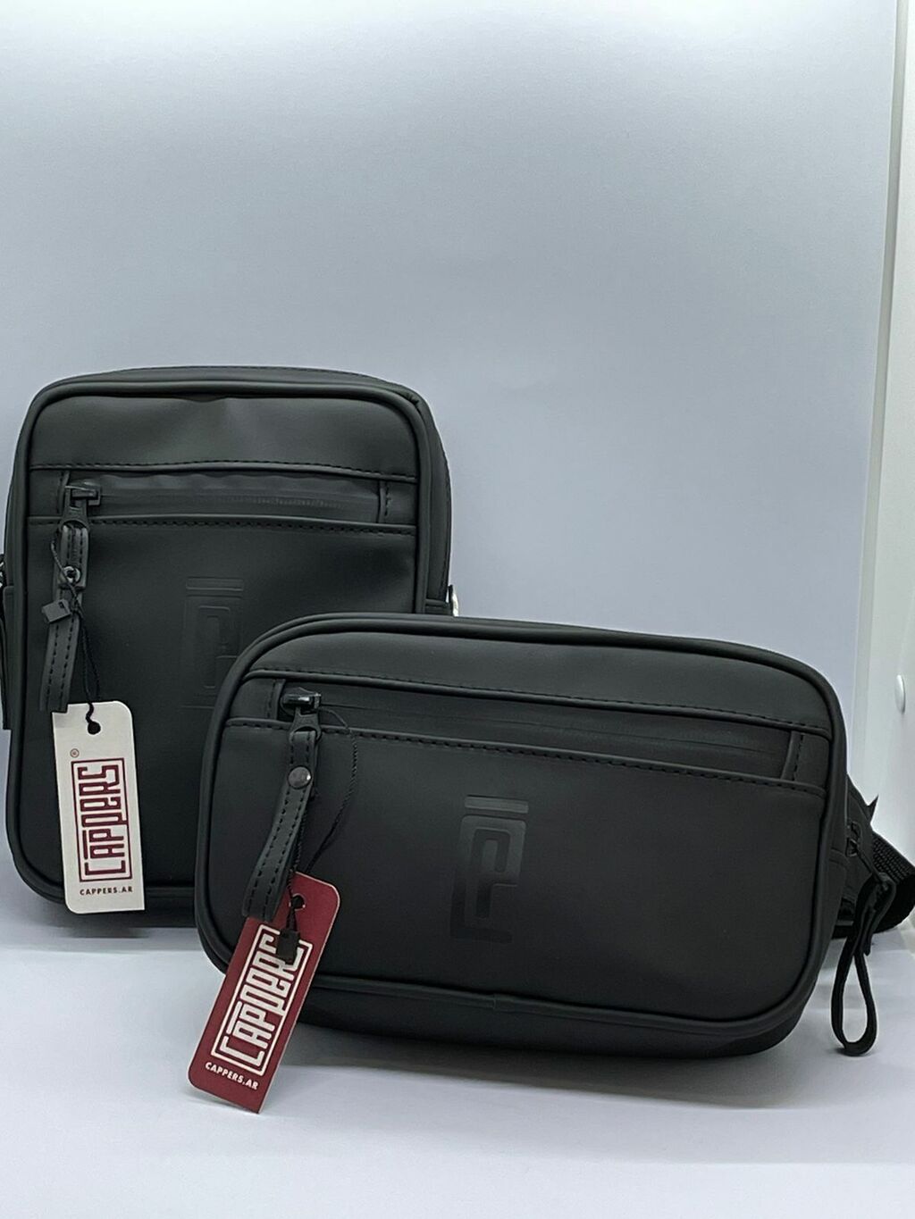 Riñonera de ecocuero engomado impermeable. Bolsillo exterior y bolsillo superior. Tela antideslizante en la parte dorsal y correa ajustable. Medidas: 23x15x6
