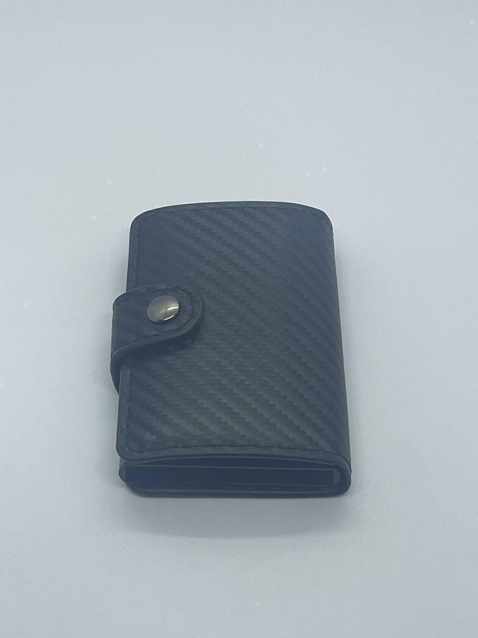 Tarjetero pop-up de aluminio cubierto en cuero. Espacio para 8 tarjetas en pop-up + capacidad adicional para documentos. Protección RFID que previene los fraudesde tarjeta. Super liviano y elegante.